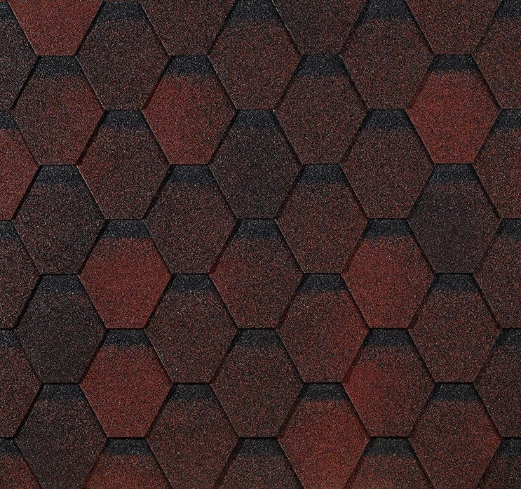 Черепицы в серии Евразия представлена в 6 уникальных оттенках, каждый из которых имеет глубокую неоднородную фактуру. За счет эстетичных оттенков красного, зелёного, коричневого цветов сочетание фасадных и кровельных материалов обеспечивает гармоничный баланс. Визуально цвет материала может отличается из-за локальных включения гранул. Черепица изготовлена из окисленного битума, гарантия на отсутствие деформаций составляет не менее 10 лет.Гибкая черепица Docke серия EURASIA шестигранник представляет собой современное покрытие для кровли, изготовление по современным технологиям. Данная модель черепицы обладает уникальной формой нарезки готов, которая представлена в виде Шестигранника. Средний показатель толщины готов составляет 2,5 мм. Визуально объемная форма черепицы придает кровле более выразительно внешний вид.