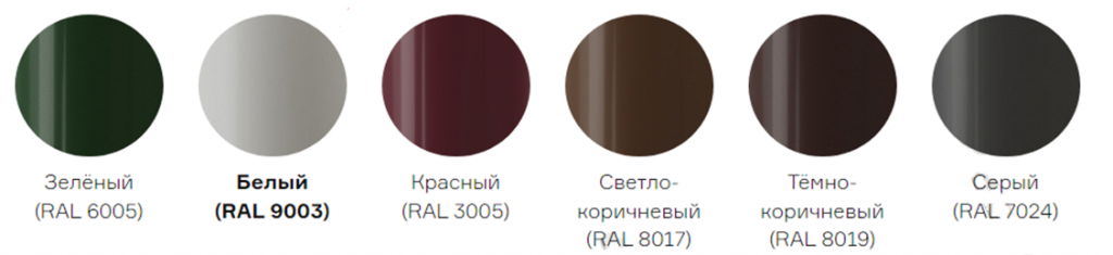 Цвета – зеленый RAL6005, белый RAL9003, красный RAL3005, светло-коричневый RAL8017, темно-коричневый RAL8019, серый RAL7024.