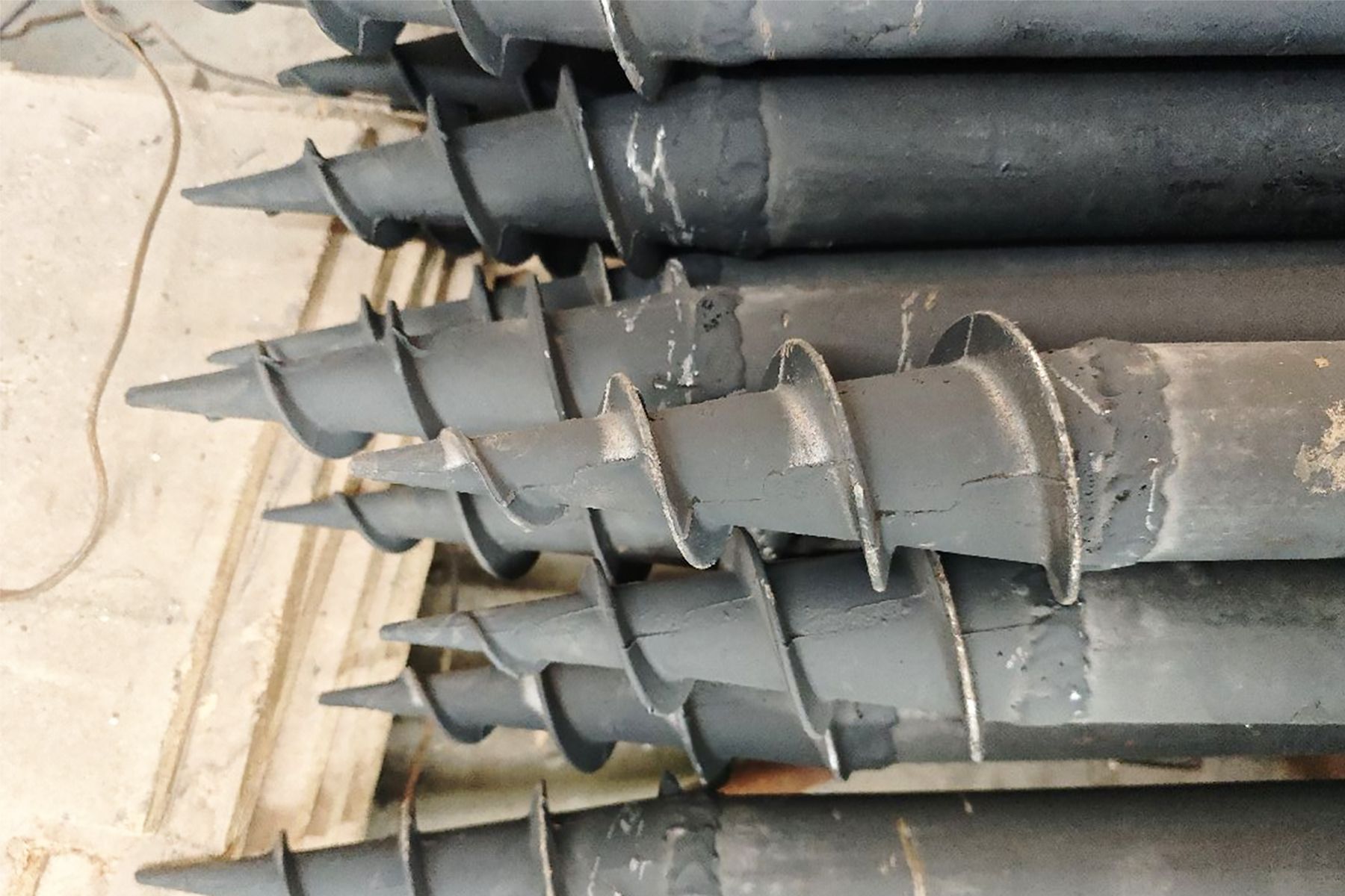 Металлические винтовые сваи – вид опорных элементов, используемых при изготовлении фундаментных оснований зданий. Конструкция включает стержень из стальной трубы, приваренный с одного конца заостренный наконечник с лопастями и верхнюю головку с плоской горизонтальной поверхностью. Устанавливаются путем вертикального ввинчивания в грунт: